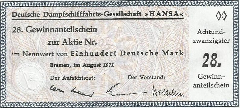 Germany Steam ship Company Hansa 1971 Profit Share certificate 100 MarksSLCD 480