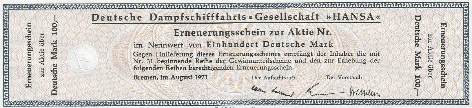 Germany Steam ship Company Hansa 1971 Profit Share certificate 100 MarksSLCD 484