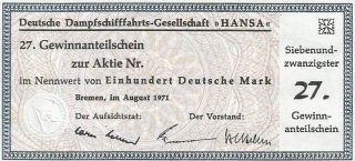 “Germany Steam ship Company Hansa 1971 Profit Share certificate 100 MarksSLCD 482” has been added to your cart. View cart