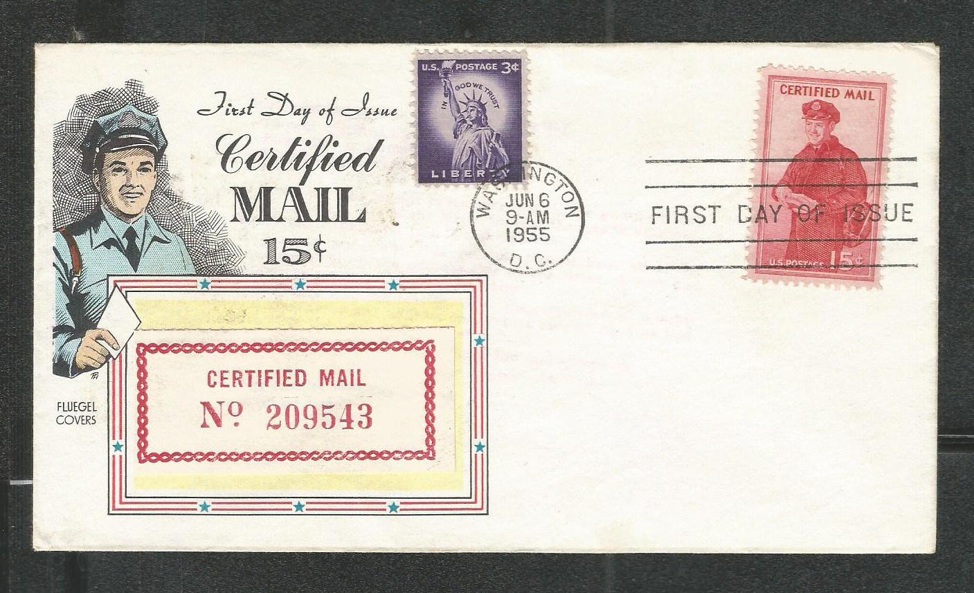 USA FDC 1955 Certified Mail Liberty Statue and Postman Stamps – Collectable Rare !!!