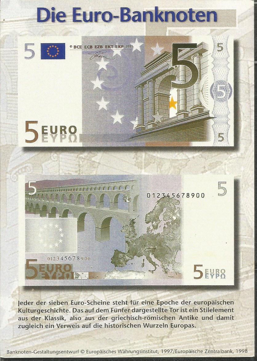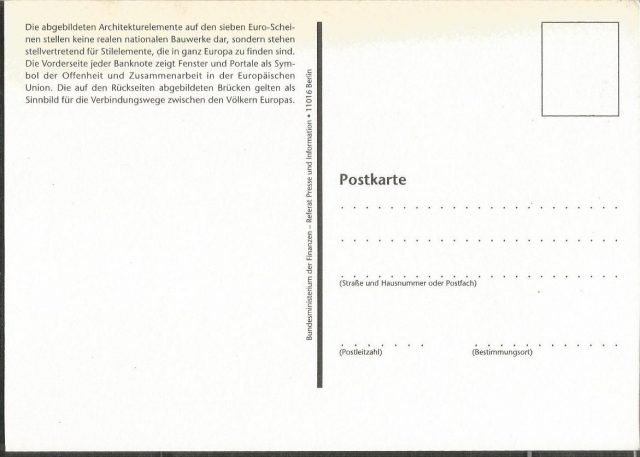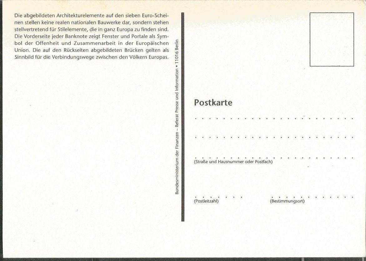 Germany 1997 Color Picture Post Card Unused – 5 Euro Banknote and its details
