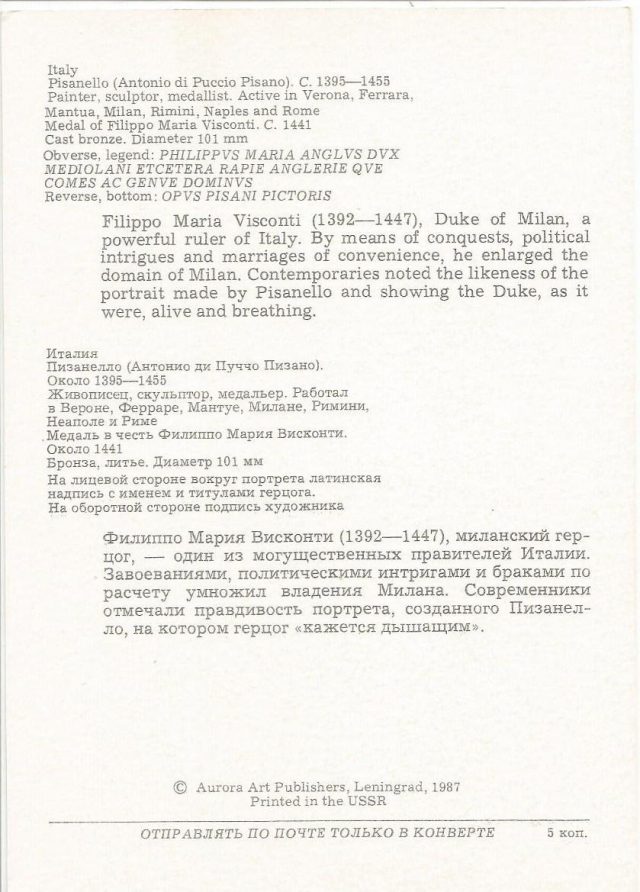 Russian Post Card 1987 – Flippo Maria Visconti 1392-1447 Duke of Milan Italy Ruler