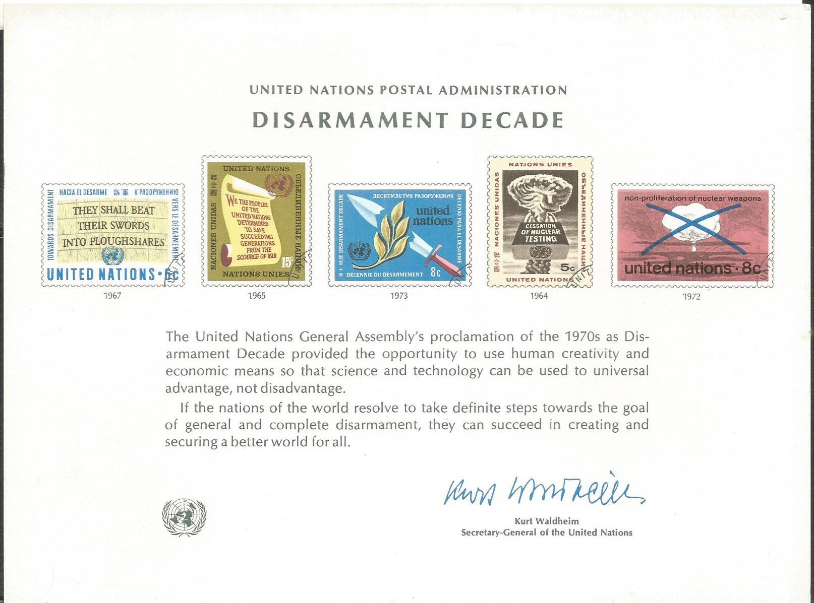 United Nations 1974 Postal Admin Souvernier Card with Printed stamps -Disarmament Decade A5 Size Card Sl1