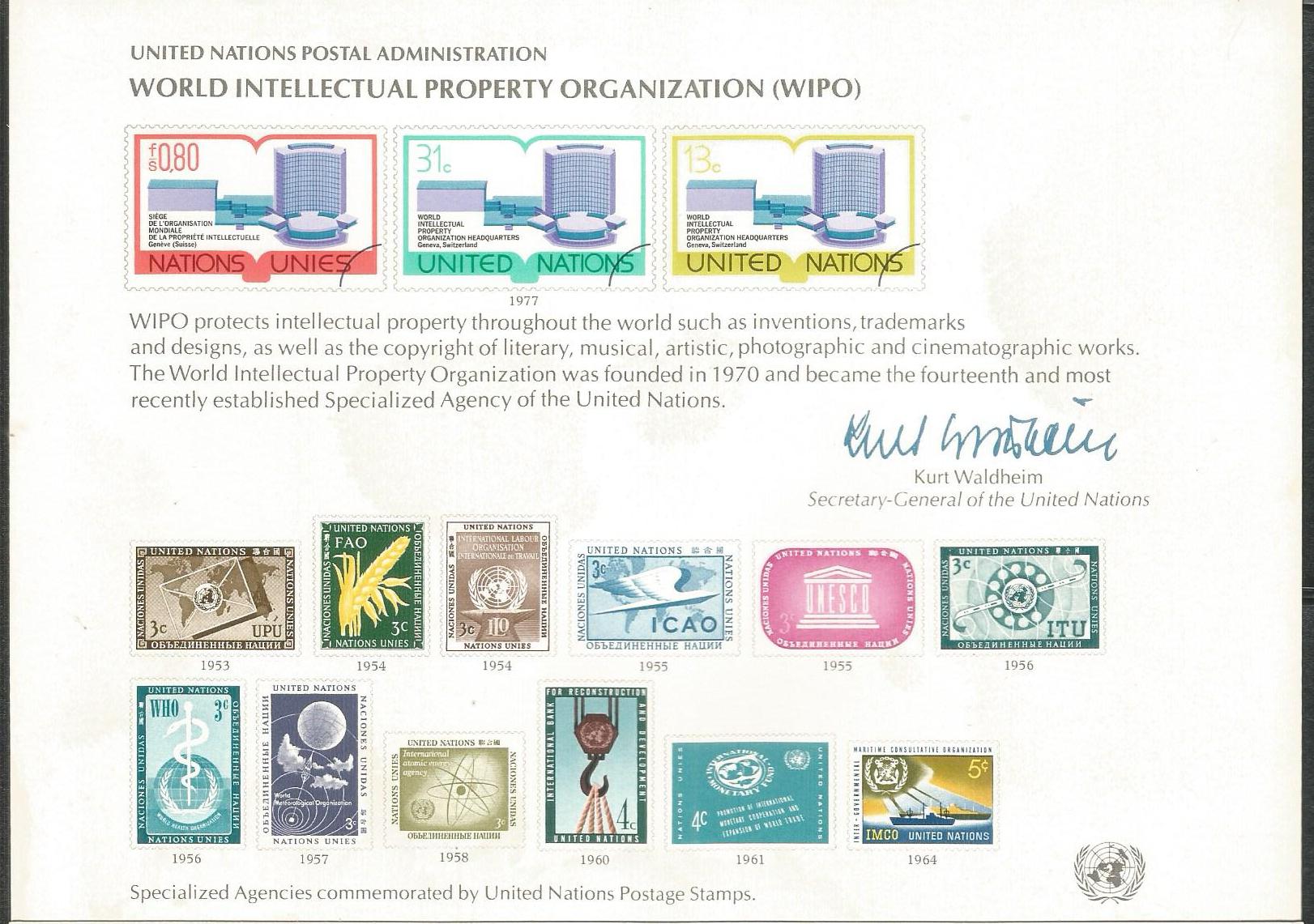 United Nations 1977 Postal Admin Souvernier Card with Printed stamps -World Intelectual Property Organization A5 Size Card