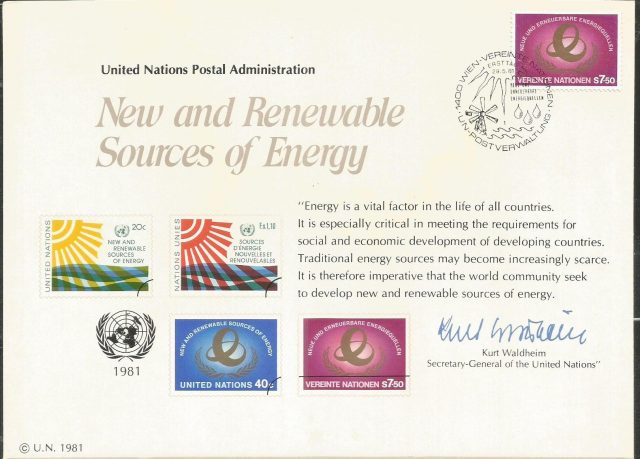 United Nations 1981 Postal Admin Souvernier Card with Printed stamps – New and renewable energy Sources A5 Size Card sl4